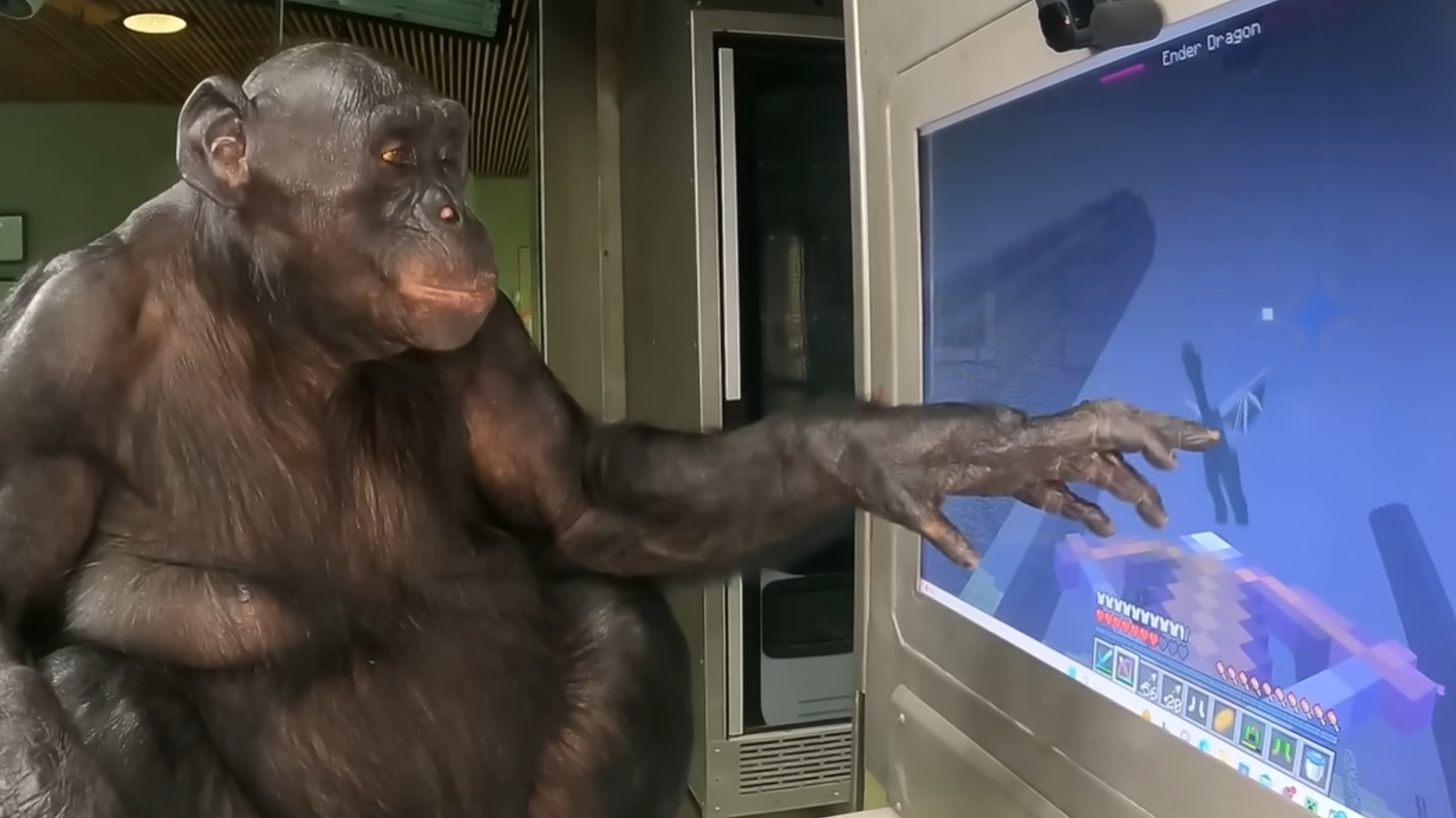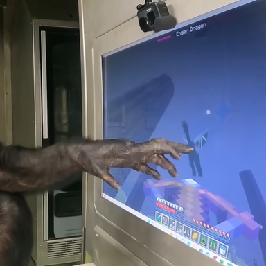 Многие геймеры узнали про Канзи благодаря блогеру ChrisDaCow — он показывал, как шимпанзе научили успешно играть в Minecraft. Ему удалось освоить основные игровые механики, вроде поиска ресурсов, строительства, копания и даже сражаться с грозным боссом Драконом Края.