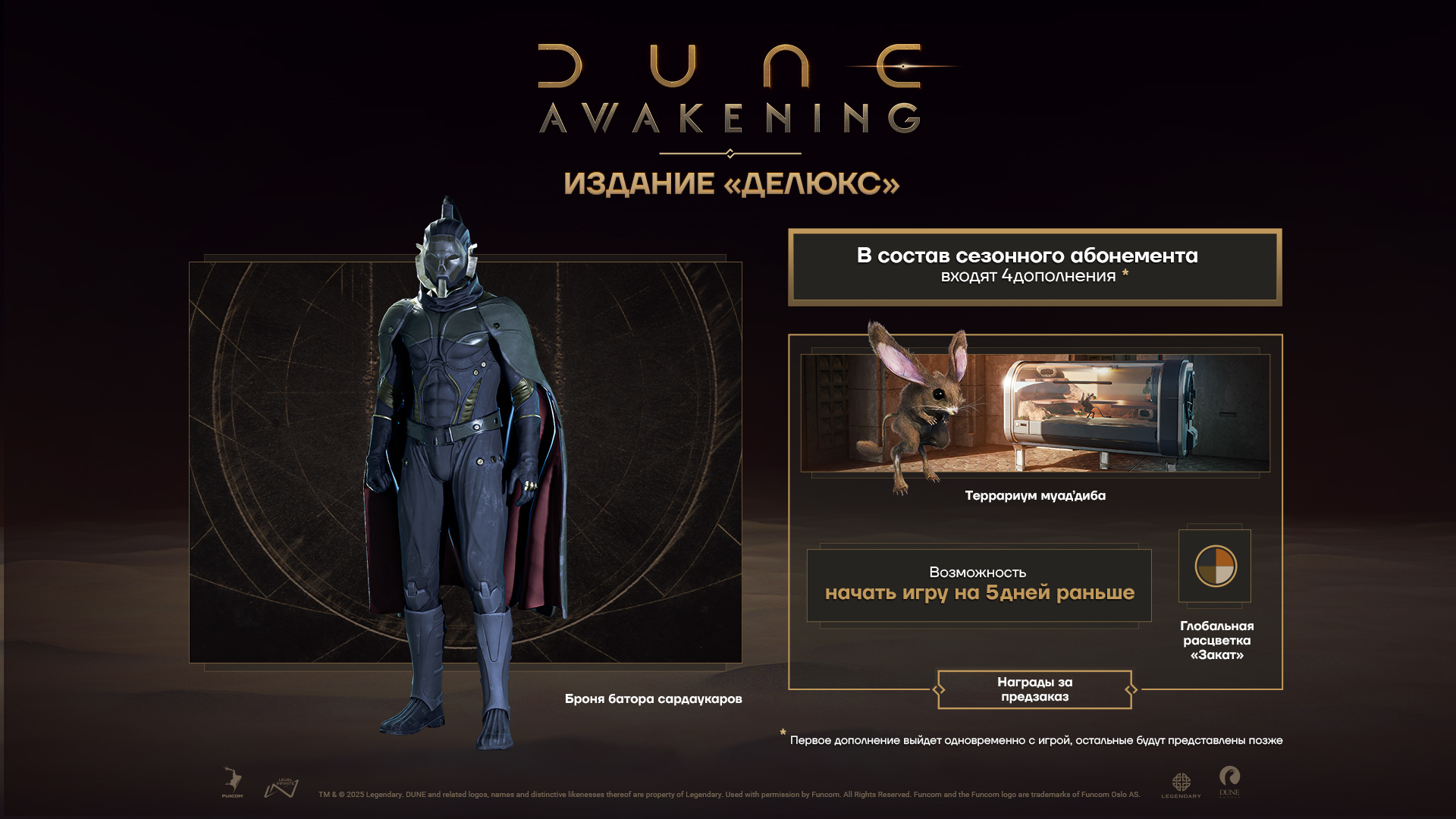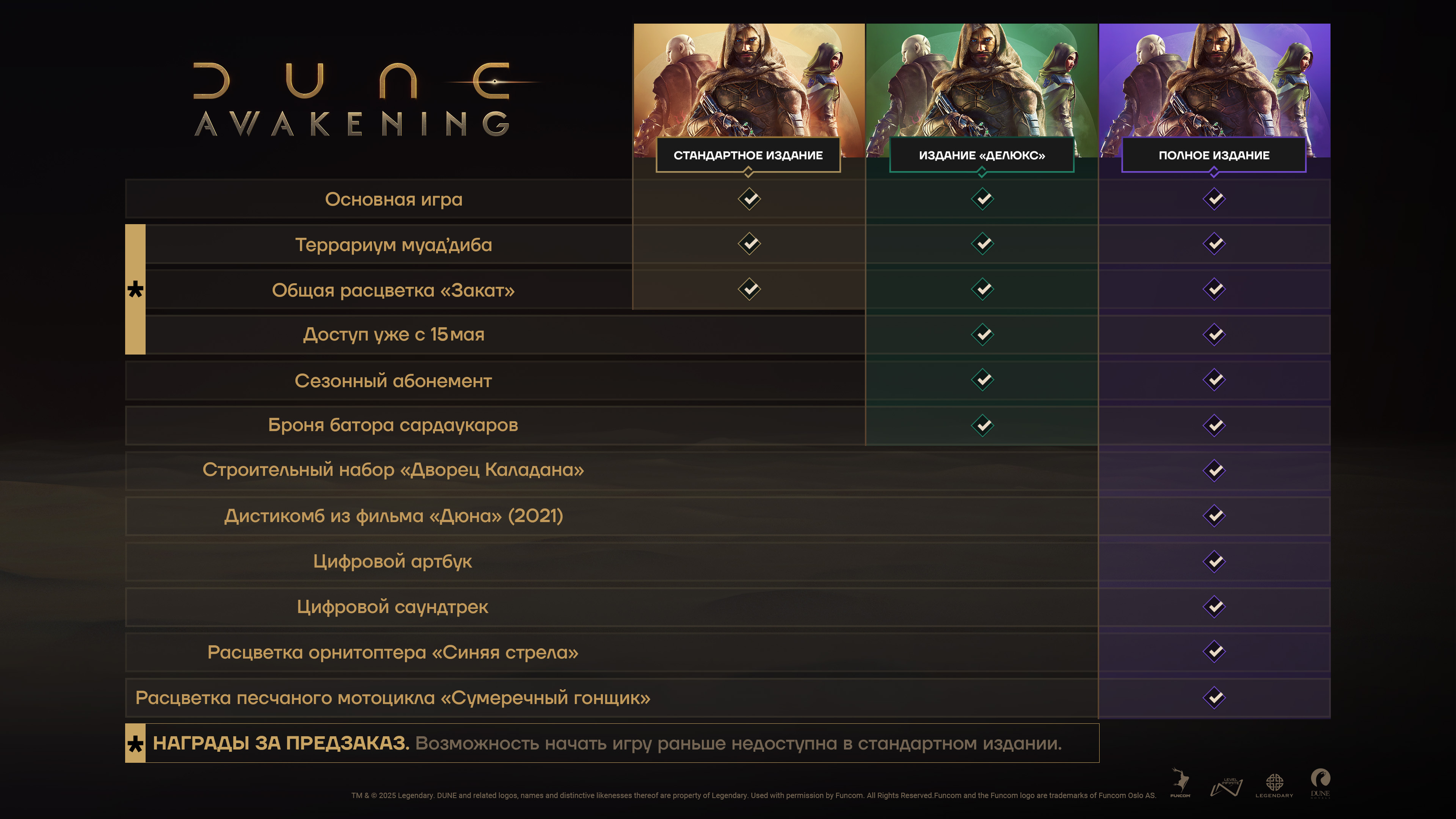 Авторы Dune Awakening сообщили о региональных ценах, а также рассказали про состав разных изданий: можно будет получить цифровой арбтук и саундтрек, а также другие бонусы, вроде Брони батора сардаукаров, строительного набора или дистикомба из фильма «Дюна» (2021).