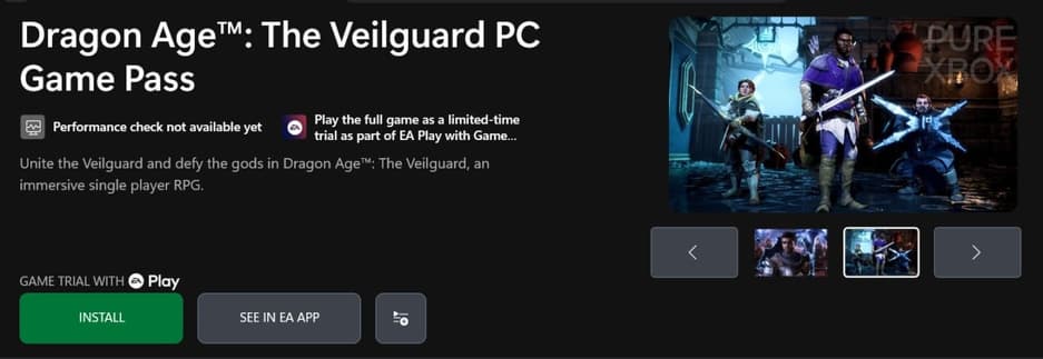 На это обратил внимание инсайдер Knobel и портал Xbox Era. В магазине Xbox для ПК появилась страница Dragon Age: The Veilguard, где указано «PC Game Pass». Возможно, это просто упоминание стандартной 10-часовой пробной версии через EA Play, но появление новой страницы может указывать на более серьёзные планы.