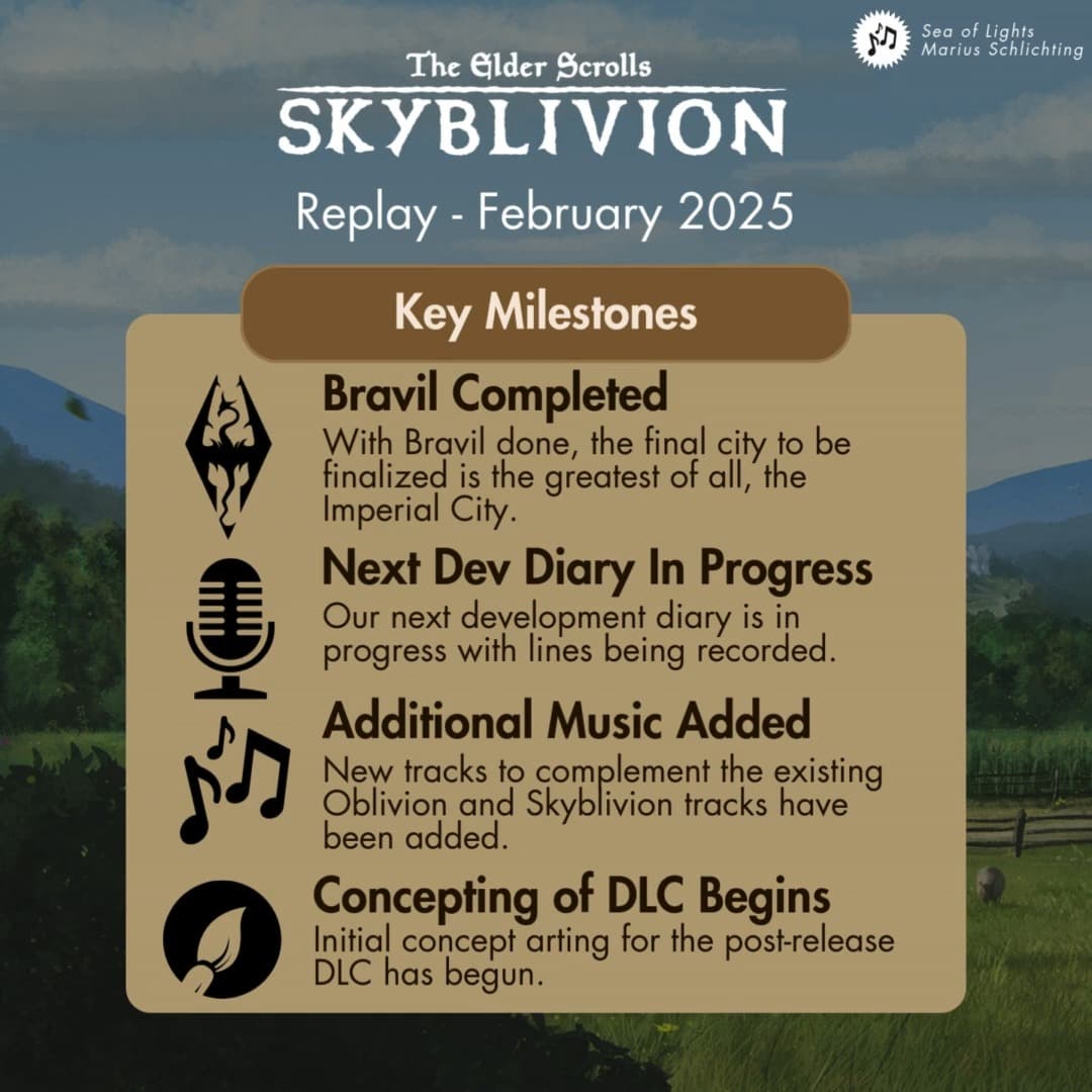 Города, такие как Бравил, теперь полностью завершены, осталось только доработать Имперский город, после чего игра будет готова к запуску. Также добавлена новая музыка, которая будет сопровождать как оригинальные треки Oblivion, так и музыку для Skyblivion.