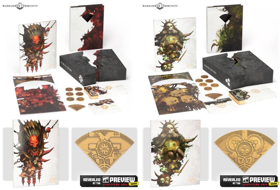 Как и Дети Императора данные кодексы получат коллекционные издания, содержащие кусочки медальона Хаоса, раздвижные коробки, карточки миссий, датакарты отрядов, металлические жетоны и карточки с артами.