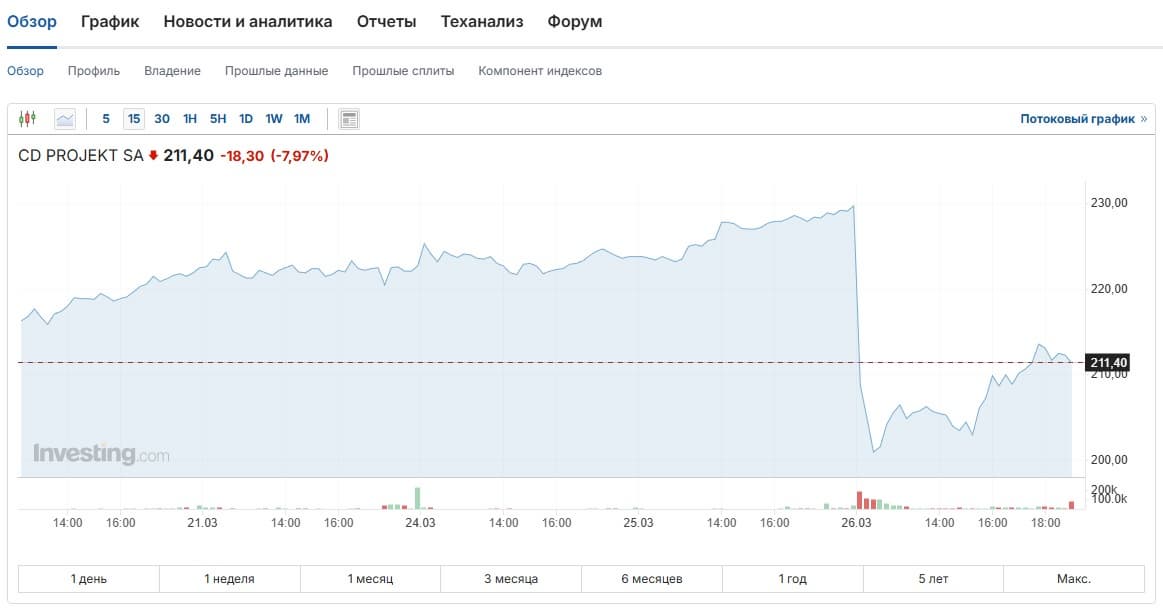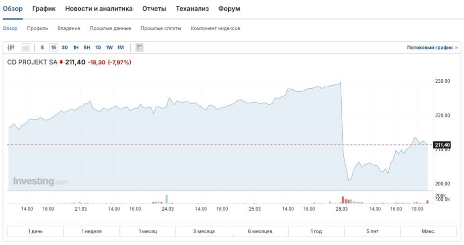 Цена акций CD Projekt упала с почти 230 злотых более чем на 10% (до 200 злотых), что стало самым слабым показателем с января. Аналитики прогнозируют, что в конечном итоге проблемы могут привести к тому, что одна акция будет стоить около 180 злотых. Но на момент публикации заметки она поднялась до 211 злотых.