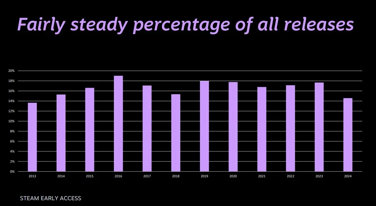 Также отмечается, что с 2013 года доля игр, выходящих в раннем доступе, удерживается в районе 13–19% от общего числа релизов.