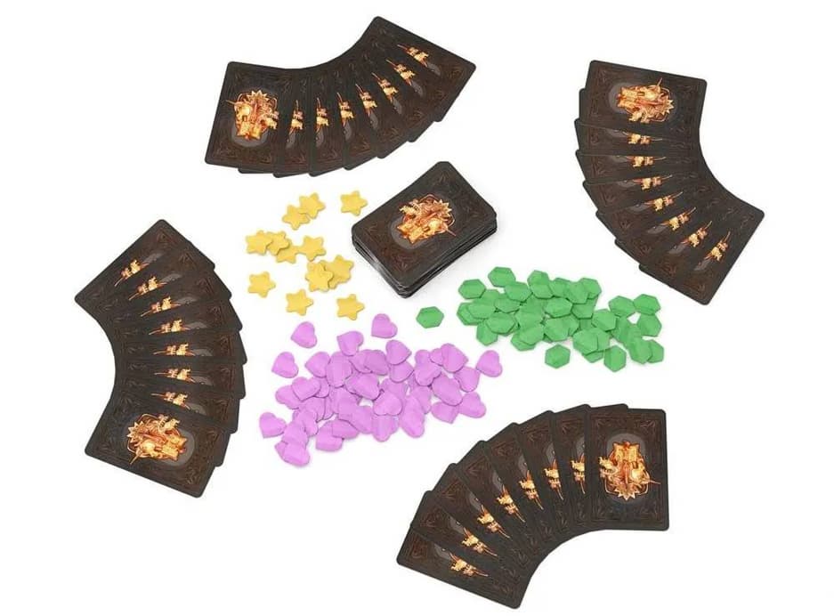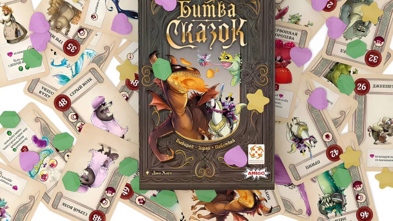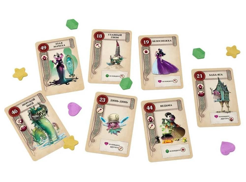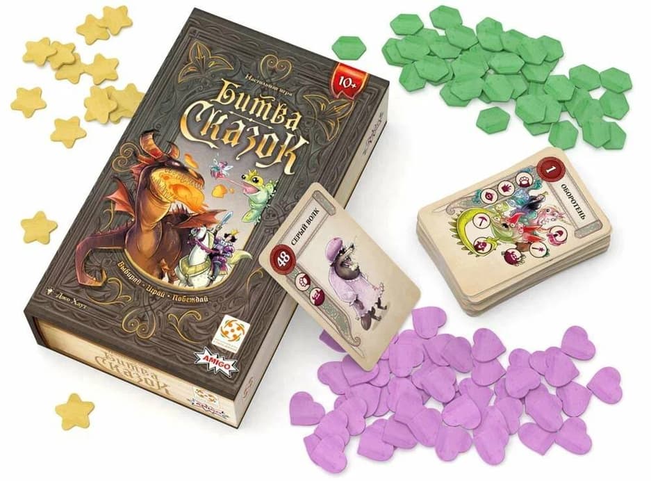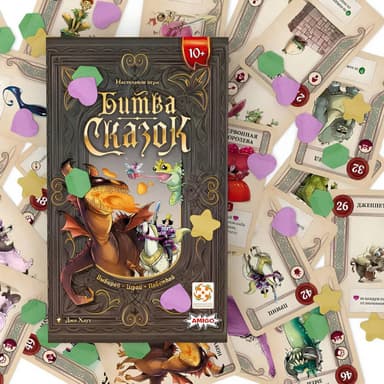 Внутри коробки «Битвы сказок» получится обнаружить 50 карточнных карточек, 115 жетонов и, естественно, правила игры.