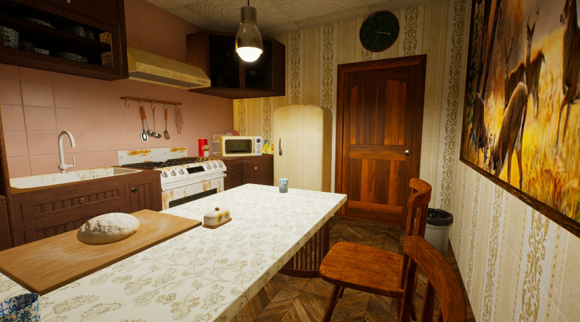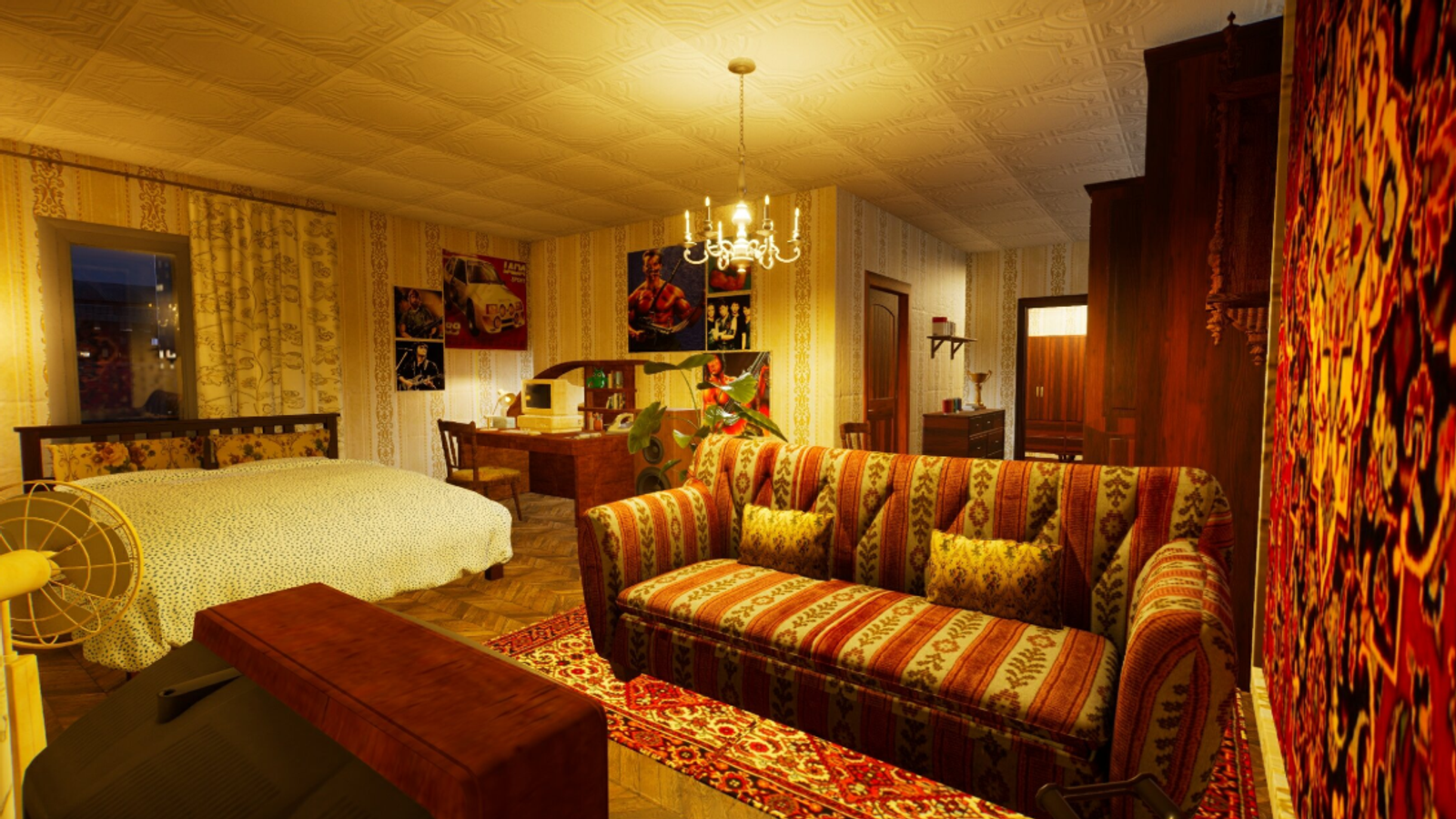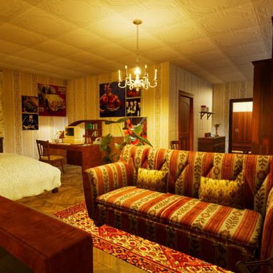 В наличии различные аутентичные элементы: знакомые многим ковры на стене и полу, характерный дизайн обоев, а на одном из скриншотов на заднем плане можно увидеть плакаты, в том числе с Арнольдом Шварценеггером.