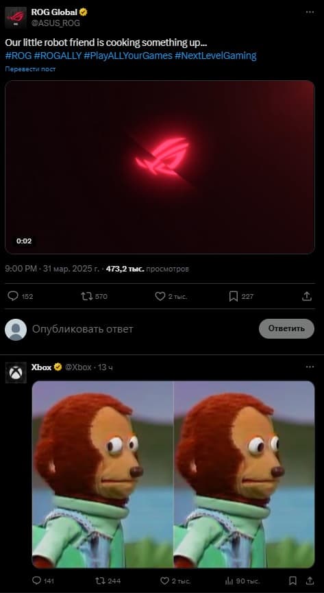 Xbox отреагировала на ролик Asus, опубликовав мем, который ранее использовали при утечке Xbox Series S. Это усилило подозрения, что проект действительно существует.