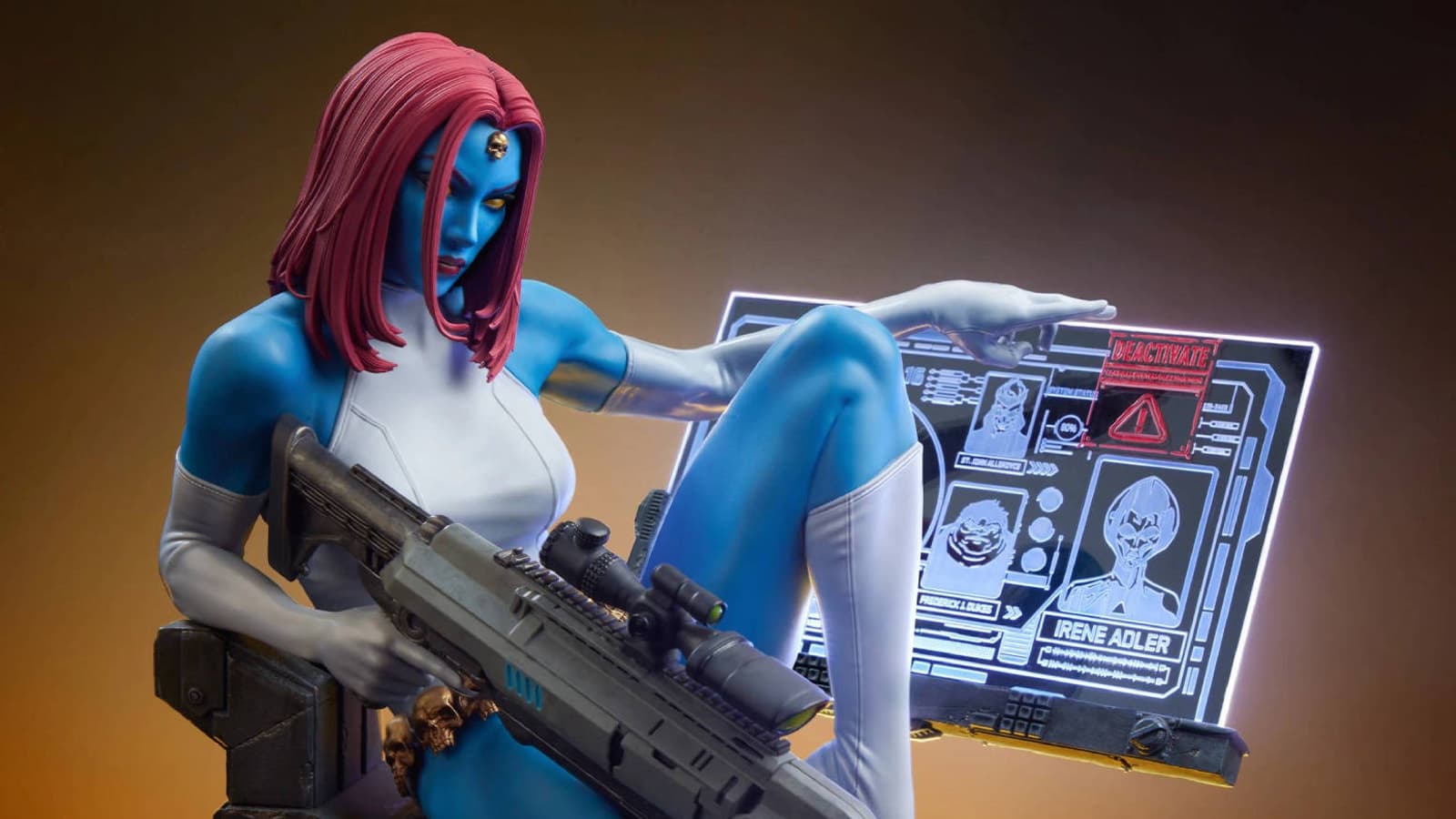 Мистик (Рэйвен Даркхолм) – мутант, способный принять внешность любого гуманоидного существа, а также скопировать голос, походку, отпечатки пальцев и рисунок сетчатки цели.