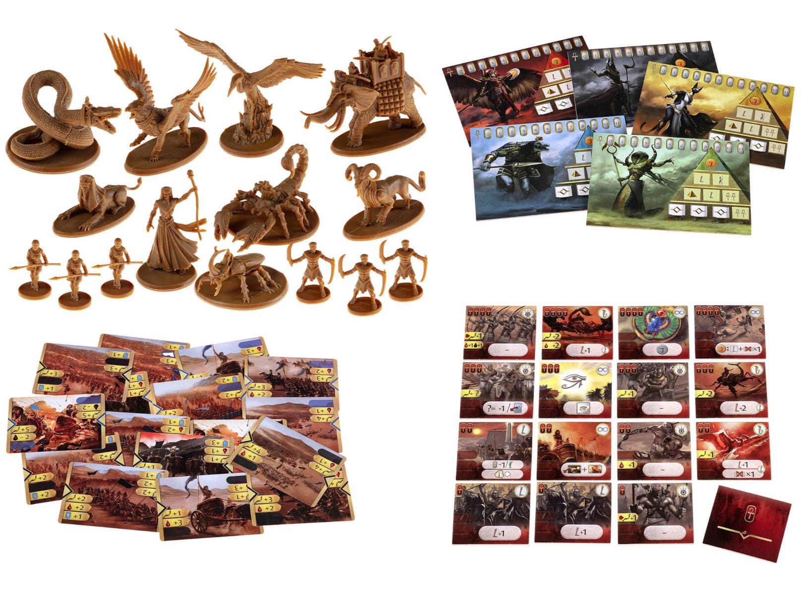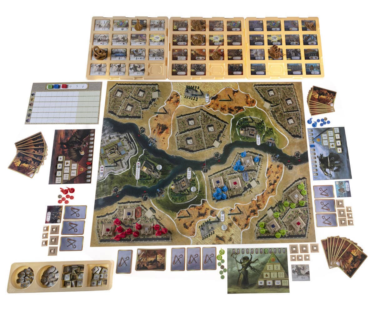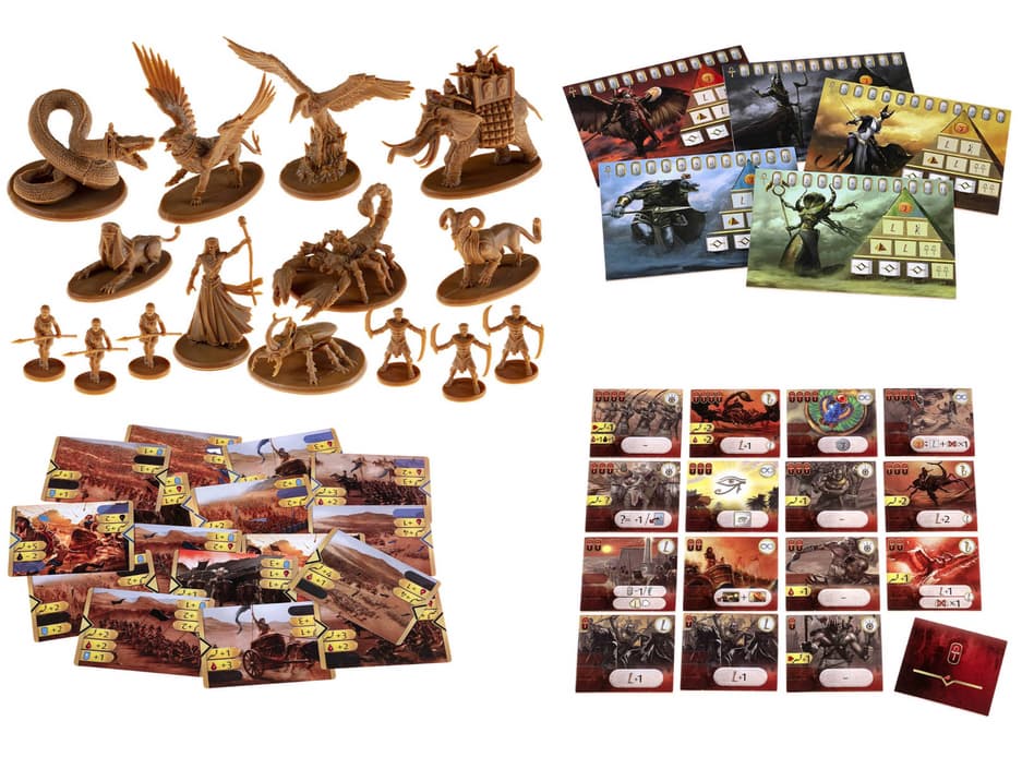 Внутри коробки получится обнаружить игровое поле, 64 жетона способностей, 10 фигурок существ, шесть фигурок наёмников, 38 карт божественного вмешательства, две особые карты сражения, планшет подсчёта очков и очерёдности хода, 80 жетонов очков славы, 20 жетонов ветеранов (с изображением скарабея), две накладки песчаных бурь, пять серебряных и пять золотых фишек действий.