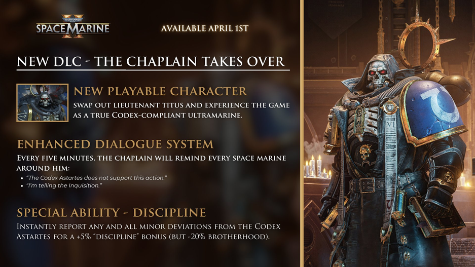 Представили дополнение Chaplain takes over с играбельным персонажем со специфическими репликами в духе «Я доложу Инквизиции»,