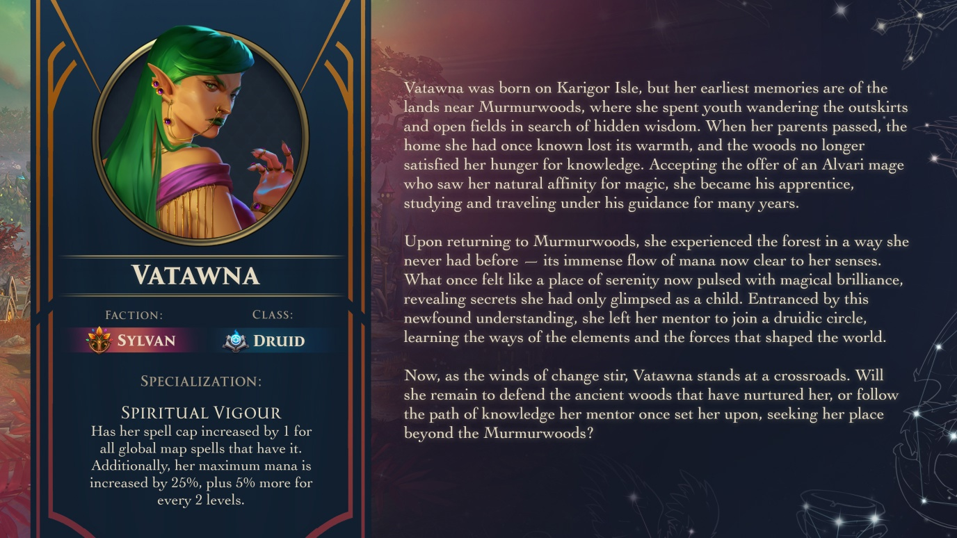 На этот раз в центре внимания оказалась Ватавна, которая «родилась на острове Каригор, но ее самые ранние воспоминания связаны с землями около Мурмурвуда, где она провела юность, бродя по окраинам и открытым полям в поисках скрытой мудрости. Когда ее родители умерли, дом, который она когда-то знала, утратил свое тепло, и лес больше не удовлетворял ее жажду знаний. Приняв предложение мага Альвари, который увидел ее природную склонность к магии, она стала его ученицей, обучаясь и путешествуя под его руководством в течение многих лет.