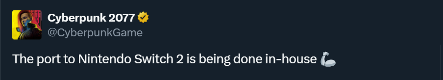 Представитель CDPR заявил: «Портирование [Cyberpunk 2077] на Nintendo Switch 2 осуществляется собственными силами» и добавил к сообщению смайлик-мускулы.