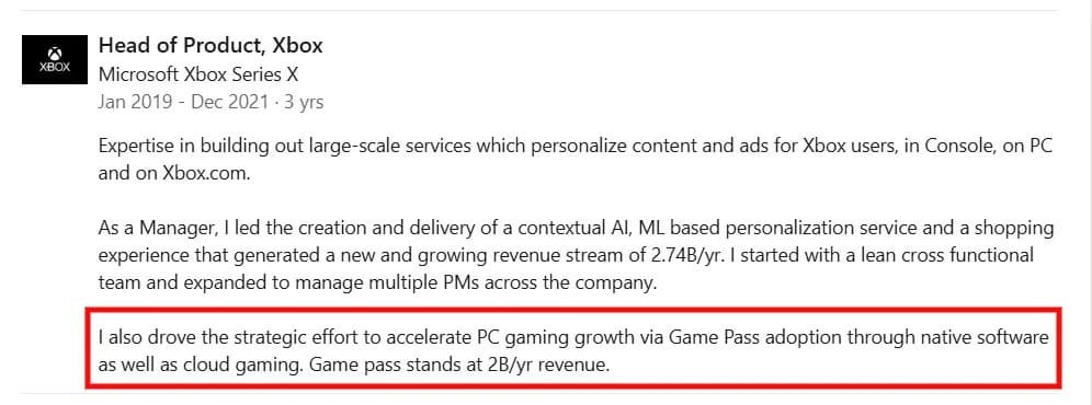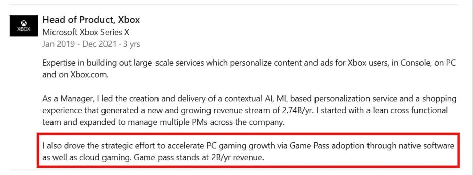 Подписочный сервис Xbox Game Pass приносил компании около $2 миллиардов в год с 2019 по 2021 год. Об этом говорится в профиле на LinkedIn бывшего главы направления продуктов Xbox Ричи Чоухари. Он покинул пост в 2021 году.