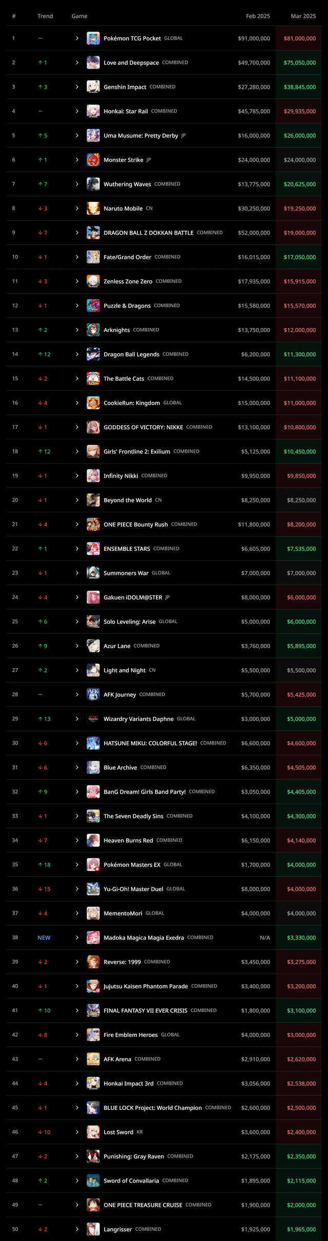 Список самых прибыльных гача-игр за март 2025 года. В данном случае учитываются данные только с мобильных устройств (изображение можно найти по следующей ссылке)