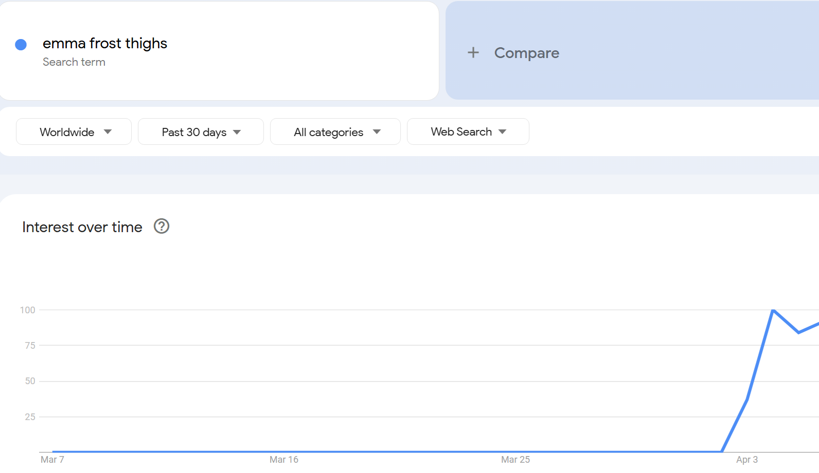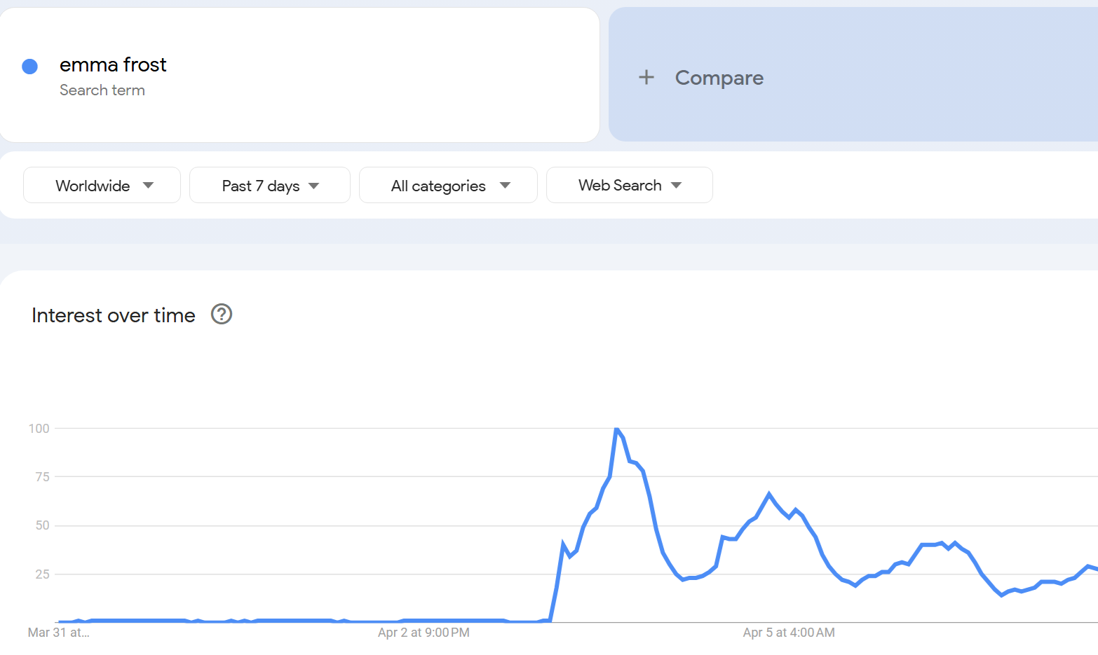 Судя по статистике, заметно возрос интерес как к самой Эмме Фрост, так и к её бёдрам. Помимо этого, кто-то пытается найти взрослый контент, вроде R34-артов с Эммой Фрост.