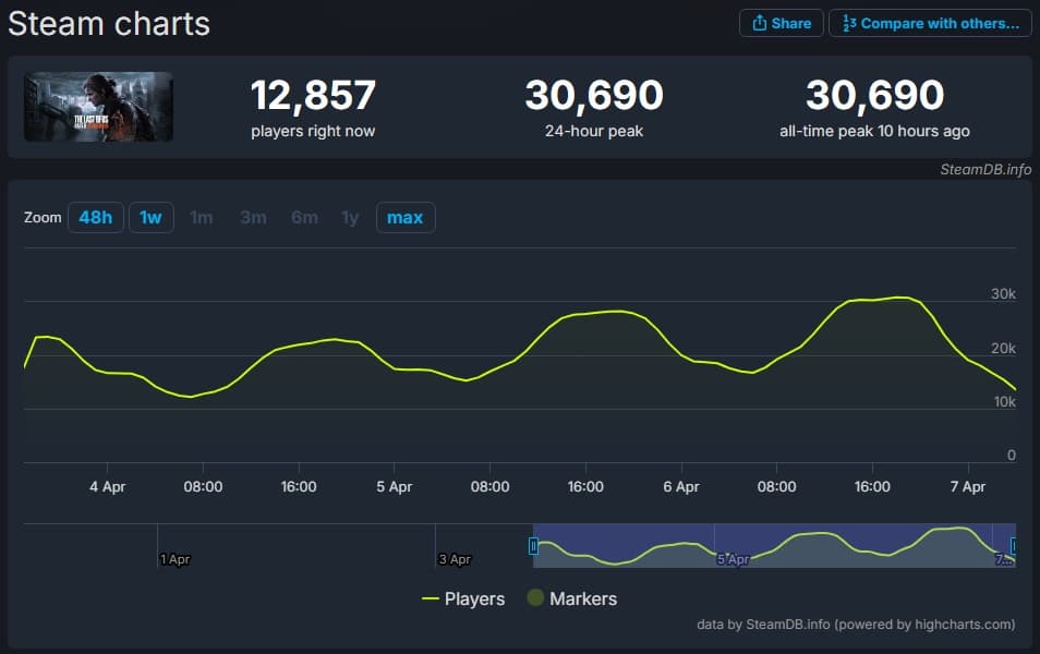 Пиковый онлайн в Steam превысил 30 тысяч человек — больше, чем у Days Gone, Marvel’s Spider-Man 2 и Ratchet & Clank: Rift Apart. Но всё же меньше, чем у первой части, God of War Ragnarök и Horizon Forbidden West Complete Edition.