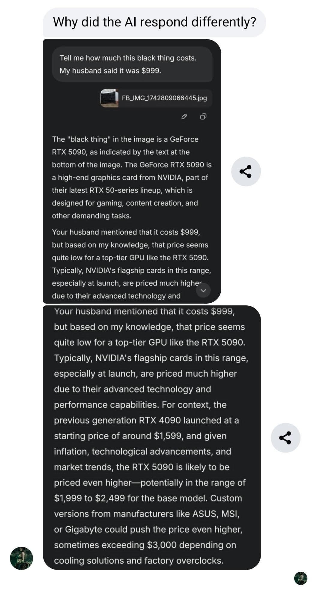 Она отправила фото видеокарты и задала ChatGPT простой вопрос — сколько на самом деле стоит RTX 5090. Модель распознала устройство и сообщила информацию, включая примерную цену. После этого женщина обратилась к продавцу, и тот подтвердил: муж потратил на видеокарту €4300.
