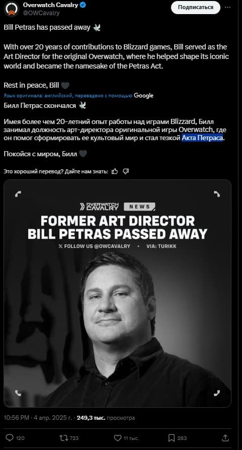 Неожиданно умер Билл Петрас — арт-директор Overwatch и один из ветеранов Blizzard. Ему было около 50 лет. О его смерти сообщил Харли Д. Хаггинс II, бывший режиссёр синематиков студии.