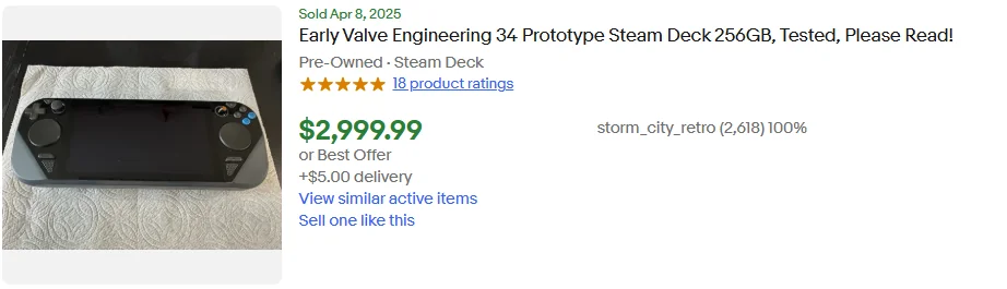 Кто-то купил «Early Valve Engineering 34 Prototype Steam Deck 256 GB» (ранний прототип). Изначально его выставили за 2999 долларов, но в итоге продали за 2 тысячи долларов — порядка 166 тыс. рублей по состоянию на 9 апреля 2025 года. На обратной стороне устройства указано, что это инженерный образец «не для перепродажи».