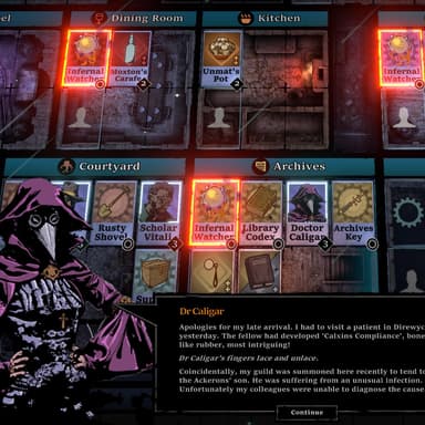 Игровой процесс основан на механиках настольных игр и карточной системе. В команде оккультных следователей — учёный Витали, механик Астор, головорез Аттикус и доктор Калигар. Каждому предстоит внести вклад в раскрытие тайн проклятого особняка, где обитают сущности из иного мира.