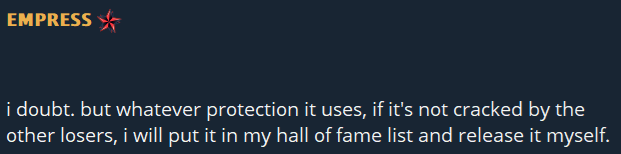 «Я сомневаюсь [что они используют Denuvo]. Но какой бы ни была защита, если её не взломают другие неудачники — я занесу её в свой "зал славы" и выпущу сама».