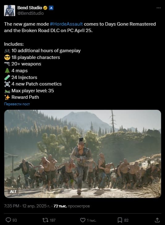 Bend Studio раскрыла подробности нового режима Horde Assault для Days Gone Remastered. Игроков ждёт около 10 часов контента, 4 карты, 18 играбельных персонажей и более 20 видов оружия, включая огнемёт.
