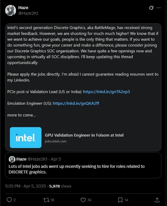 Intel продолжает развивать направление дискретных видеокарт и теперь нацелилась на топовый сегмент. Компания открыла десятки вакансий в подразделении GPU, а в недавнем заявлении подтвердила, что планирует «намного больше», чем текущие модели Arc B580 и B570.