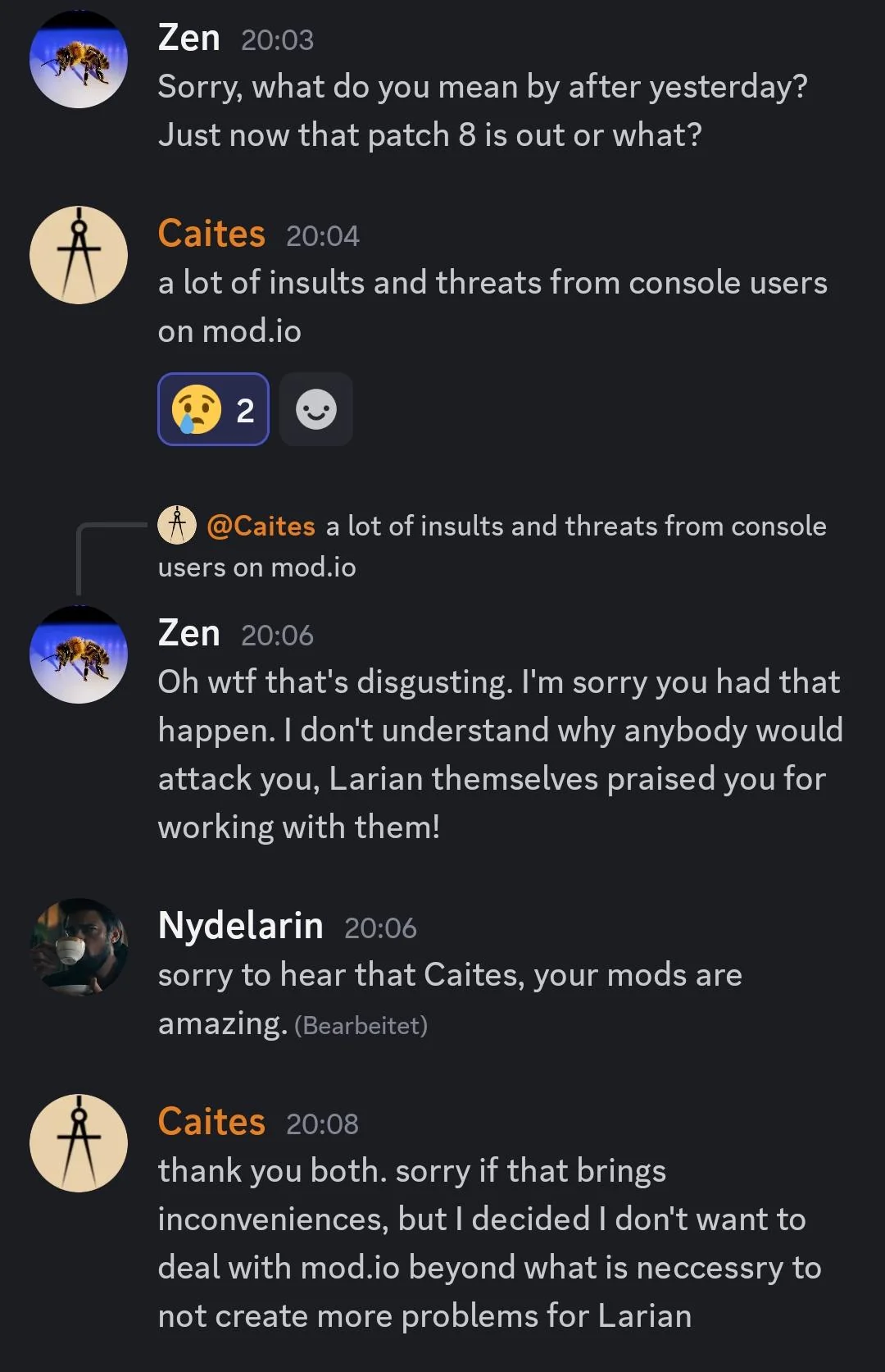 «Много угроз и оскорблений от консольщиков на Mod.io [...] Извините, если это доставляет вам неудобства, но я решил, что не хочу иметь дело с Mod.io сверх необходимого, чтобы не создавать больше проблем для Larian».