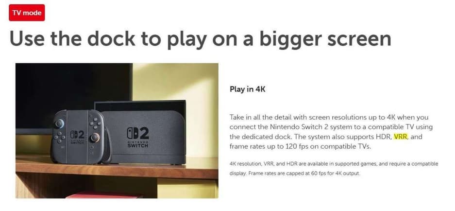 Сначала указывали, что 4K, HDR и VRR доступны только в поддерживаемых играх, а 4K ограничено 60 кадрами. Сейчас VRR в обоих пунктах больше не упоминается. Nintendo не объяснила, почему данные изменились. Не исключено, что VRR добавят позже, как это было с PS5, но пока это лишь предположение.