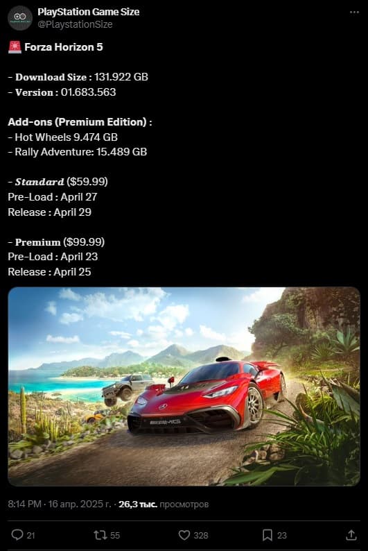 На Xbox и ПК игра уже собрала более 45 миллионов игроков. В версии для PS5 обещана та же масштабная открытая карта и динамичная погода. Это не только визуально насыщенная гонка, но и тяжеловесный проект — и по контенту, и по весу.