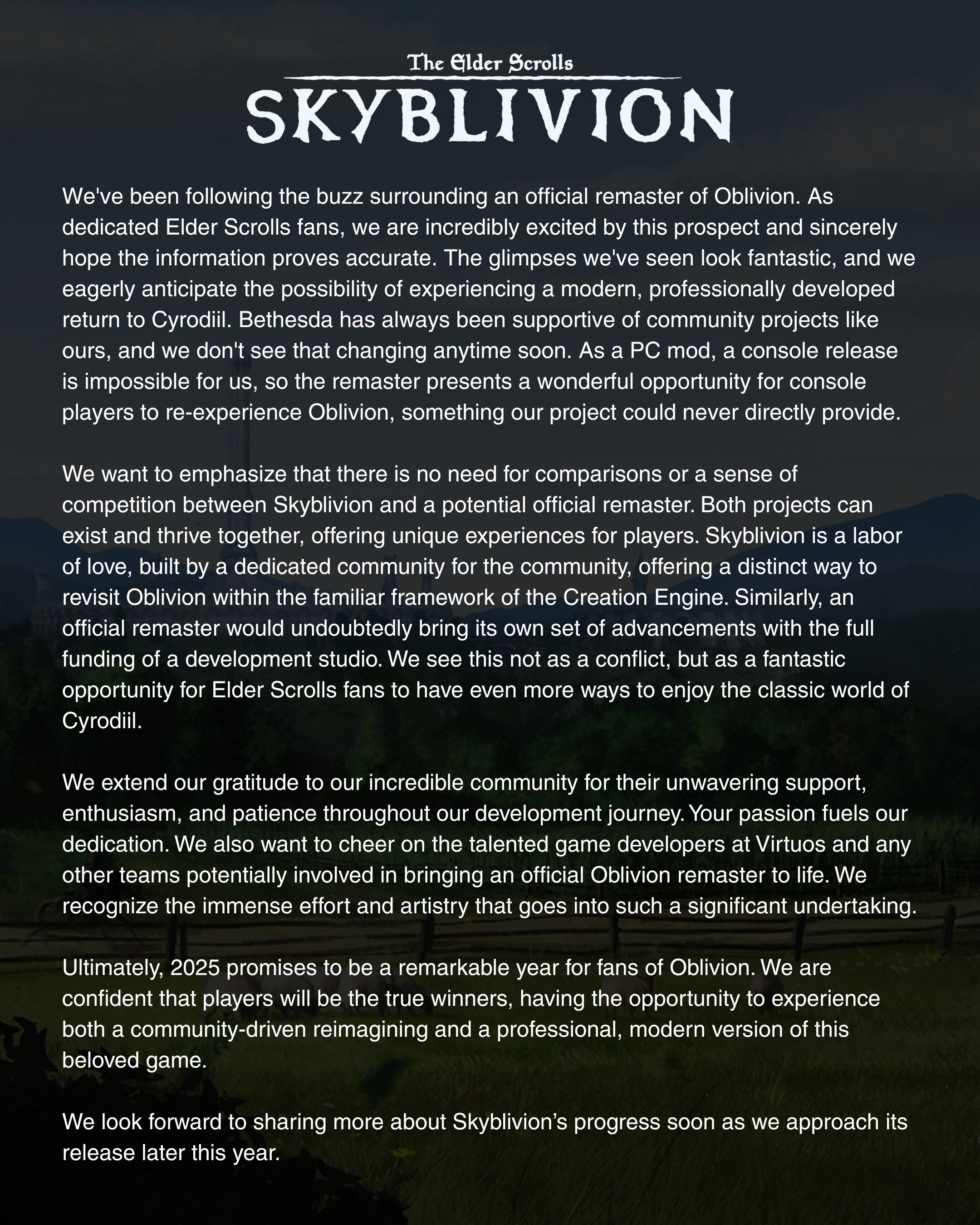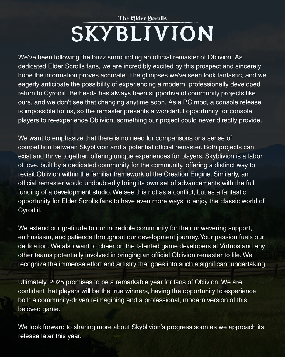 Мы хотим подчеркнуть, что нет никакой необходимости в сравнениях или ощущении конкуренции между Skyblivion и потенциальным официальным ремастером. Оба проекта могут существовать и процветать вместе, предлагая игрокам уникальный опыт. Skyblivion — это труд любви, созданный преданным сообществом для сообщества, предлагающий особый способ пересмотреть Oblivion в знакомых рамках движка Creation Engine.