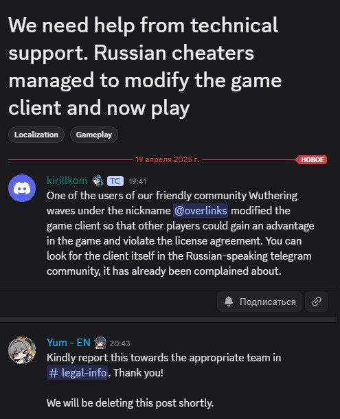 В фанатском сообществе Wuthering Waves рассказали о том, что на пользователя OVERLINK, распространяющего русификатор, написали донос.