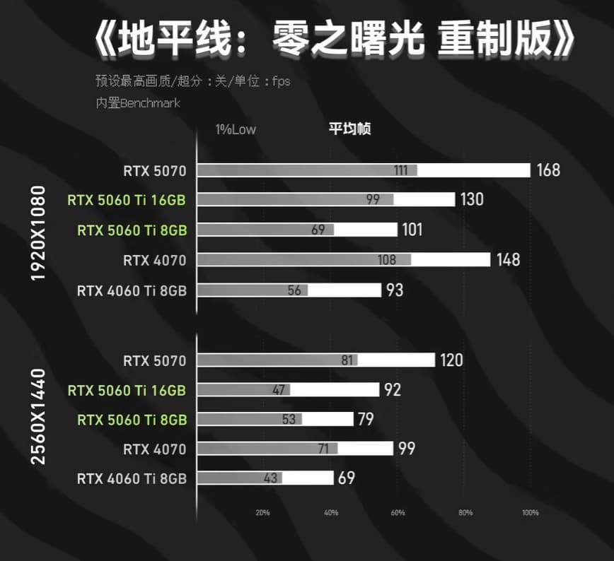 В Horizon Zero Dawn Remastered, где рекомендуется 16 ГБ видеопамяти, старшая RTX 5060 Ti показывает на 29% больше кадров в 1080p и на 16% в 1440p. Еще более поразительны так называемые 1% lows (среднее значение 1% самых низких fps за время теста ) — у 8 ГБ версии просадки до 30%.