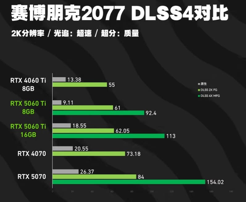 Cyberpunk 2077 с DLSS 4 и максимальными настройками в 2K: 16 ГБ версия — 18,5 fps без генерации кадров, 8 ГБ — 9,1 fps. С включённым FG x2 разница минимальна (61 против 62 FPS), но при MFG x4 старшая модель выдает 113 fps, тогда как младшая — только 92,4 fps. Потеря в производительности достигает 22%.