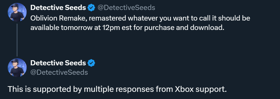 «Ремейк Oblivion или ремастер — называйте как хотите — должен быть доступен для покупки и скачивания завтра в [19 часов по московскому времени]. Это подтверждается многочисленными ответами службы поддержки Xbox».