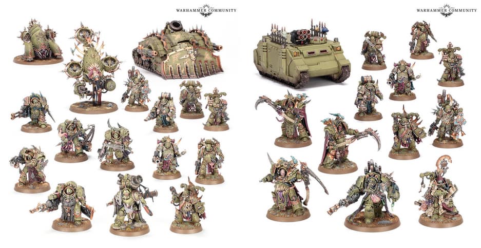 «Гвардия Смерти» благодаря наборам с миниатюрами «Боевая сила Poxwrought Vector» и «Боевой патруль Death Guard» получит Повелителя Вирулентности, Саван Смерти – терминаторы Хаоса, чумных десантников, терминаторов Скверны и такую технику, как «Носорог» Хаоса – бронетранспортер, Foetid Bloat-Drone – дрон, Myphitic Blight-Hauler и Plagueburst Crawler – самоходки.