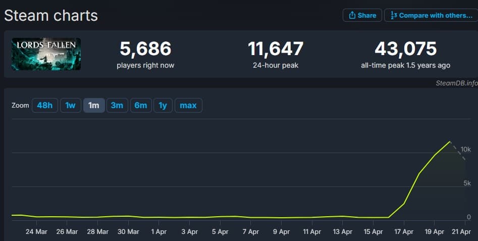 Обновление 2.0 вдохнуло в Lords of the Fallen вторую жизнь. Онлайн в Steam вырос с 500+ до 11 647 человек — рост более чем в 20 раз. Такой всплеск активности произошёл спустя полтора года после релиза.