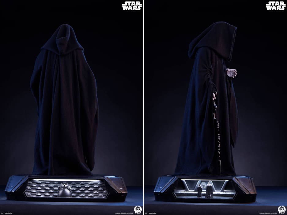 Высота статуи равна 63,5 см, ширина – 40,64 см, глубина – 33,02 см. В наборе удастся обнаружить робу, трость Императора – артефакт ситхов в виде глянцевой чёрной трости, и пьедестал-подставку со светодиодной подсветкой.