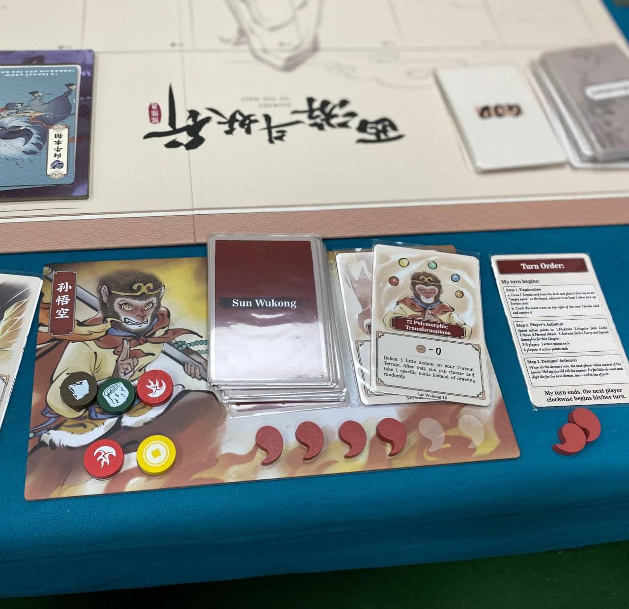 В этой настолке, предназначенной для 2-4 игроков, людям предстоит наблюдать за похождениями танского монаха Сюаньцзана, царя обезьян Сунь У-куна, Чжу Бадзе, являющегося наполовину человеком, а наполовину свиньёй, и песчаного демона Ша-Сэна, вставшего на путь просветления (каждый персонаж обладает своей колодой действий).