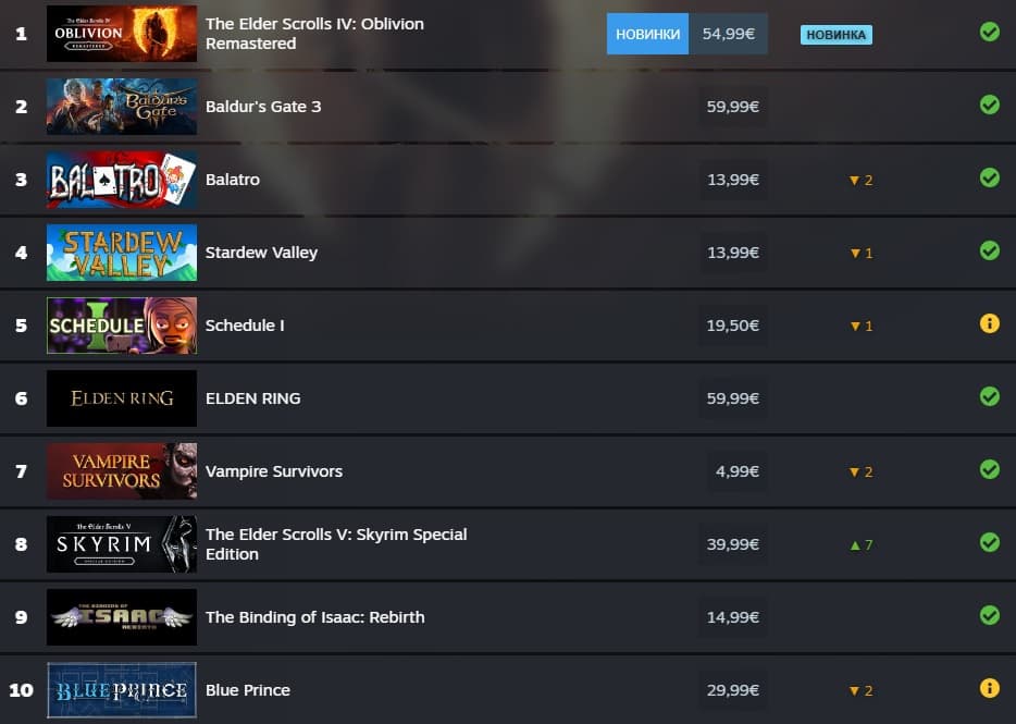 Ремастер The Elder Scrolls IV: Oblivion быстро стала лидером продаж в чартах Steam. Переиздание классической боевой ролевой ролевой игры вызвало волну интереса, но на Steam Deck закрепилась на втором месте по количеству запусков.