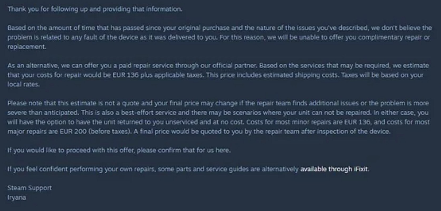 Пользователь под ником weerg поделился своей историей. У него сломалась кнопка R1 на Steam Deck и он обратился в поддержку Valve. В бесплатном ремонте ему было отказано и предложили решение, которое неприятно удивило weerg ценой.