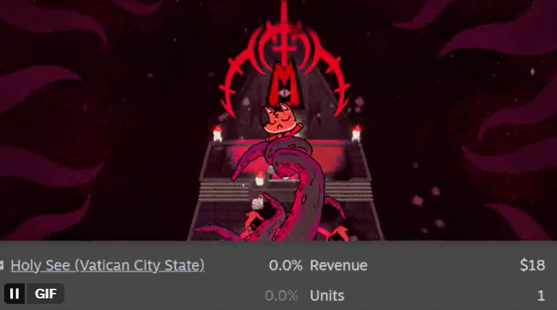 Рогалик Cult Of The Lamb о создании собственного культа от студии Massive Monster, оценили игроки из разных регионов. Как оказалось, недавно появился игрок из Ватикана (или пользователь, чей аккаунт там зарегистрирован).