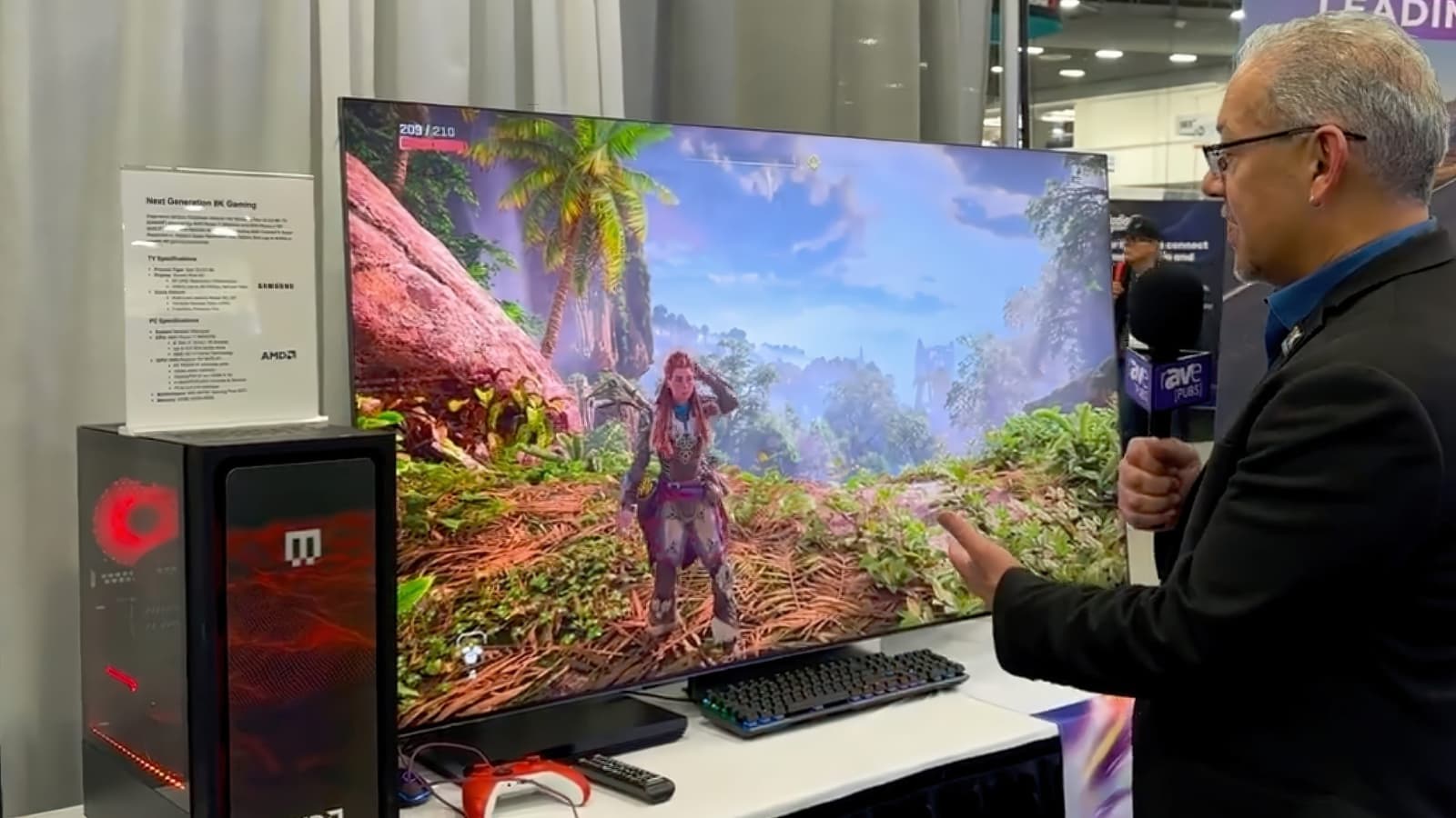 В центре демонстрации стоял ПК на базе AMD: процессор Ryzen 7 9800X3D и видеокарта Radeon RX 9070 XT. Изображение выводилось на модифицированный телевизор Samsung Neo QLED 8K, поддерживающий ALLM, VRR и FreeSync Premium Pro. Horizon Forbidden West рендерилась в 5K и с помощью AMD FSR 3 масштабировалась до 8K. Передача сигнала шла по HDMI 2.1b с активным DSC — в результате получилась плавная и яркая картинка.