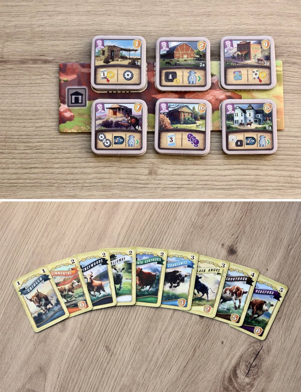 В коробке получится отыскать четыре планшета игроков, четыре пастуха, 55 монет, восемь фишек собственности, четыре фишки сертификатов, 16 жетонов обмена, четыре карточки поезда, 11 карточек соло-режима, 91 карточку скота, 48 карточек рабочих, шесть жетонов нейтральных построек, 14 жетонов общих построек, поле рынка скота, поле построек, блокнот, игровое поле, жетон Эль-Пасо и правила игры.