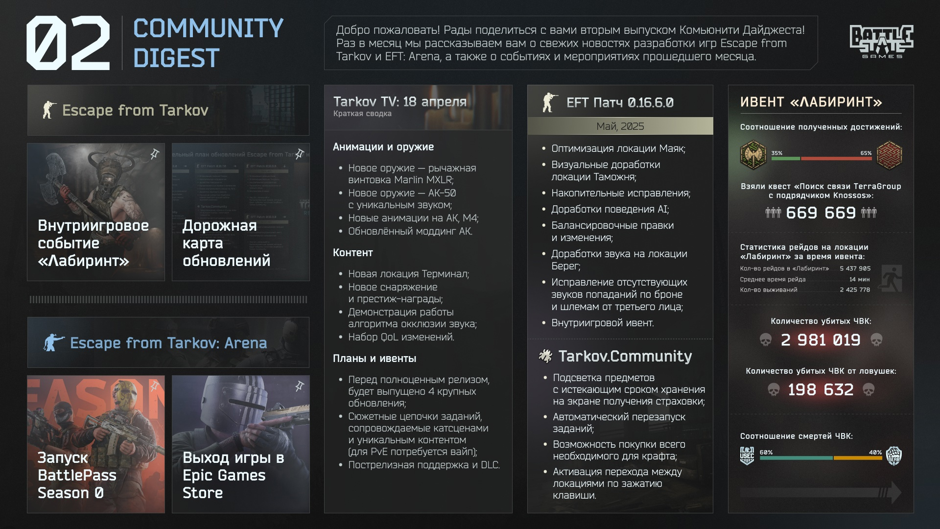 «Рады представить вам второй выпуск Комьюнити Дайджеста! Раз в месяц мы делимся свежими новостями о разработке игр Escape from Tarkov EFT Arena, а также рассказываем о событиях и мероприятиях прошедшего месяца.