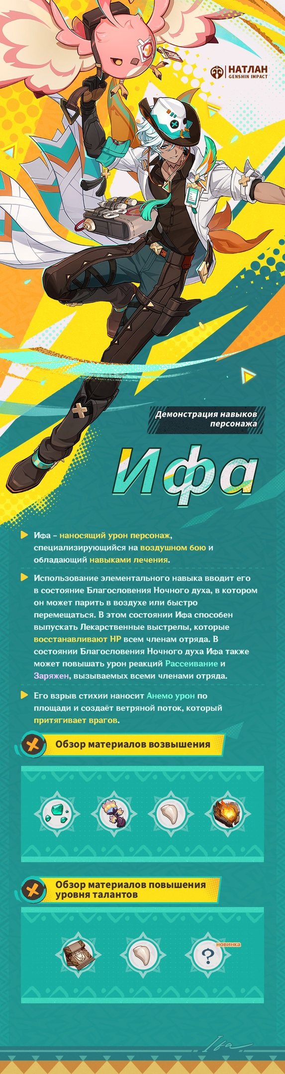 Ифа в Genshin Impact это герой с 4 звездами редкости, его стихия Анемо и в бою он использует Катализатор. miHoYo (HoYoverse) представила обзорный трейлер и рассказала про механики лечебного десантника: персонаж наносит урон и специализируется на воздушном бою, обладает навыками лечения.
