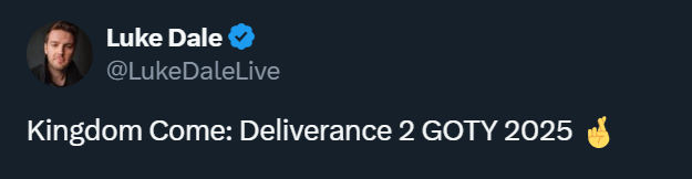 Например, поспешил высказаться актёр Люк Дейл, исполнивший в KCD 2 роль Яна Птачека: «Kingdom Come Deliverance 2 — "Игра года" (2025)». Сами разработчики из Warhorse пока не делали подобных заявлений.