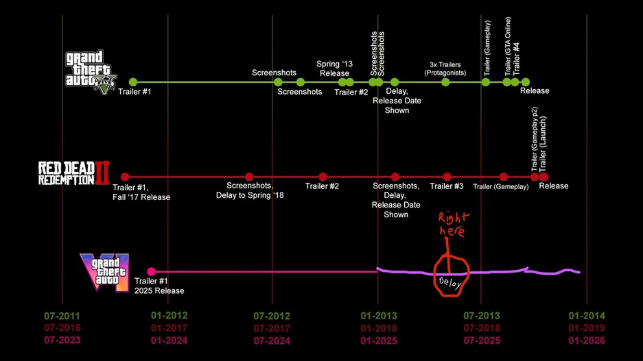 Nonesuch1221 составил график публикации маркетинговых материалов и релизов GTA 5 и Red Dead Redemption 2 — в случае с GTA 6 многие отмечают «радиомолчание Rockstar» (хотя и это считается некоторыми участникам обсуждения «нормой»).