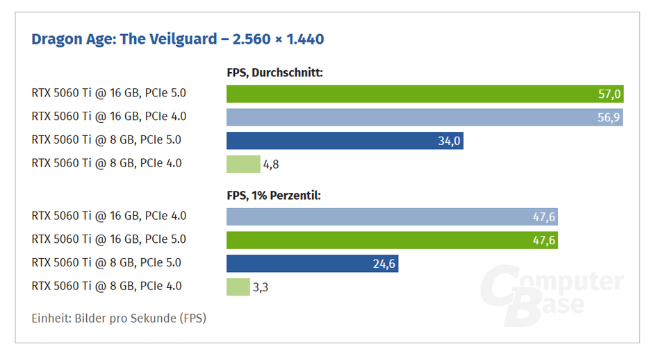 При переключении 8 ГБ-версии RTX 5060 Ti с 5.0 на 4.0 наблюдается падение производительности, в то время как на 16 ГБ-версии разница очень маленькая — в случае с Dragon Age The Veilguard FPS в 8 раз меньше.