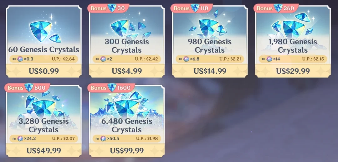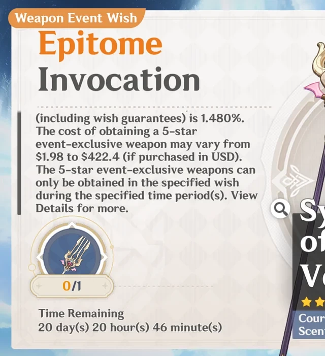 В описании баннеров персонажей и оружия Genshin Impact появился фрагмент с указанием минимальной и максимальной стоимости выбивания героя — от $1,98 до $475,2 (до ~38 тыс рублей на 5-звёздочного героя), а на выбивание топового оружия можно потратить от $1,98 до $422,4 (~34 тыс. рублей).
