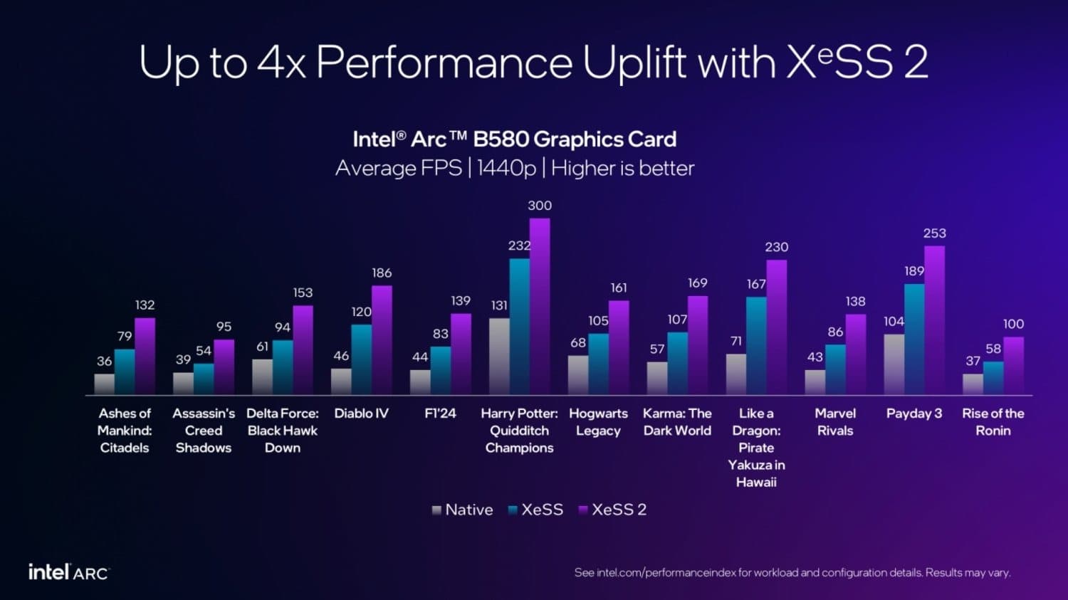 Хотя XeSS 2 пока доступна только в 19 играх, Intel отмечает, что внедрение ускоряется. Компания приводит конкретные примеры: в Diablo IV на GPU Arc B580 рост производительности достигает 4 раз, в Assassin’s Creed: Shadows — в 2,4 раза.
